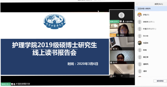 读书报告是公司产品的重要环节,QY球友会制定了详细的读书报告计划,由学院主导,全体研究生参与,每隔半月一次,导师轮流主持,现场点评打分,从而规范研究生过程管理。读书报告从研一第二学期开始,每一届研究生的第一次读书报告会都是由护理学科带头人徐桂华教授主持。3月6日晚7时,导师和同学们准时进入腾讯会议“云课堂”, 开启2019级研究生第一次读书报告会。